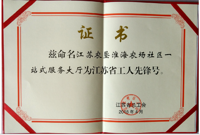 近日,省總工會授予江蘇農(nóng)墾淮海農(nóng)場社區(qū)一站式服務(wù)大廳獲江蘇省“工人先鋒號”榮譽(yù)稱號,這是淮海農(nóng)場社區(qū)首次獲此殊榮。