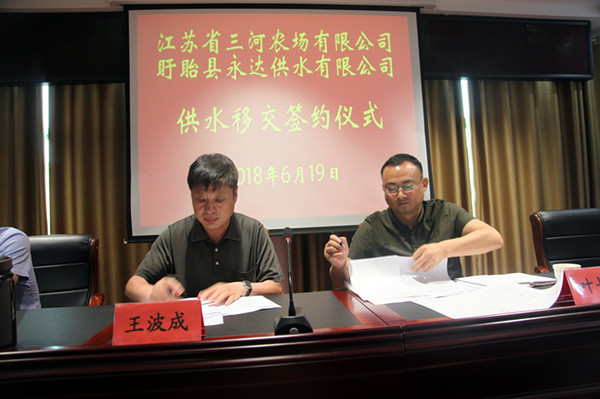 6月19日上午,三河農場有限公司供水移交協(xié)議簽訂儀式在三河農場有限公司會議室舉行。三河農場有限公司黨委書記、董事長、總經理王波成與盱眙縣天源水務有限公司副總經理葉長征簽訂《江蘇省三河農場有限公司供水質量提升改造項目和分離移交框架協(xié)議書》。三河農場有限公司相關部門、單位和盱眙縣天源永達供水有限公司相關人員參加簽約儀式。