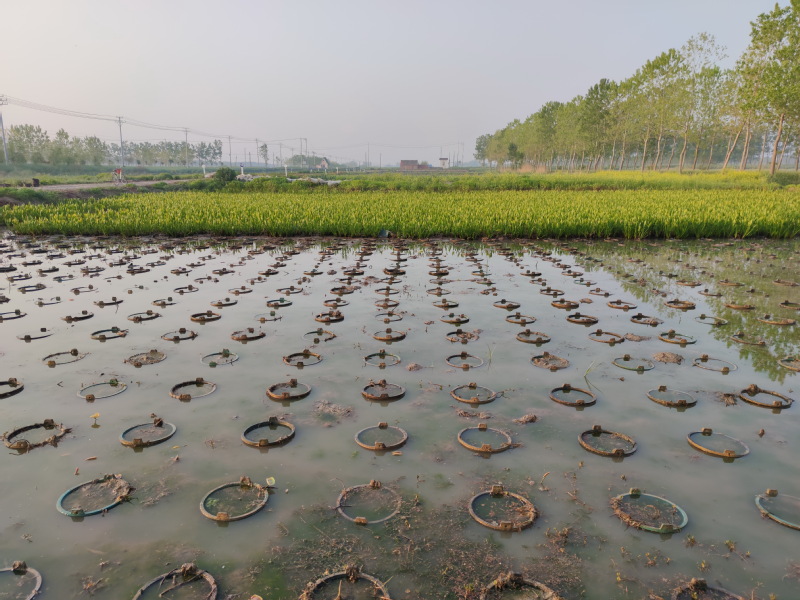 原來,在愛蓮苑苑區(qū),每年繁育了近400個(gè)荷花品種,每一個(gè)品種就是一個(gè)花色,這里既有中國普遍的大型荷花,也有愛蓮苑自行培育出來的荷花品種,每一個(gè)荷花品種都是十分金貴。如果這么多荷花品種自行栽植在田畦里,根系就會(huì)相互穿插、影響,造成荷花品種的混雜,從而失去市場競爭的優(yōu)勢。為此,愛蓮苑通過把一個(gè)個(gè)荷花品種,通過圖紙編排設(shè)計(jì),建立苗圃的方式,把各個(gè)荷花品種以盆栽和膜栽的方式,排列在畦池中,阻礙荷花根系的延伸,并用小木棍編上各個(gè)特制的號碼,通過圖紙和號碼,就可以知道這盆荷花是什么品種等相關(guān)信息。同時(shí)為了防止混雜,苑區(qū)的花農(nóng)們,在荷花生長的旺季,每隔一段時(shí)間,就會(huì)清理掉伸出盆外或膜外的岔枝,從而從源頭上阻礙了品種的混雜。圖為目前生長在田間的盆栽和膜栽荷花原始鏡頭。