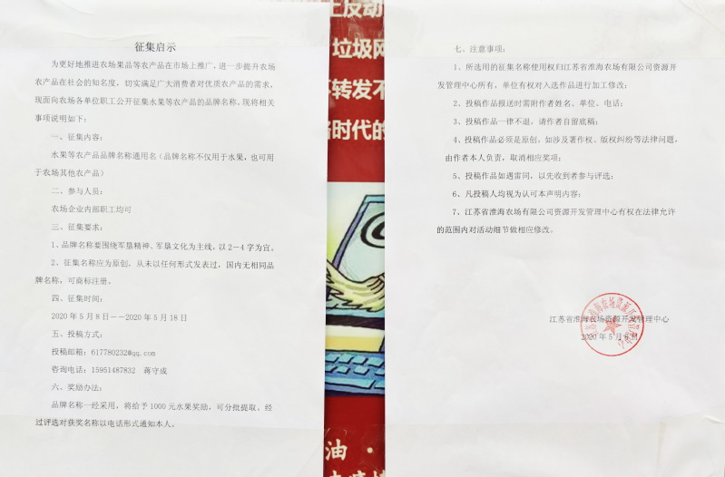 昨天下午,淮海資源開發(fā)管理中心同步在農(nóng)場(chǎng)公司企業(yè)微信平臺(tái)、農(nóng)場(chǎng)公司機(jī)關(guān)櫥窗及社區(qū)以及各居委會(huì)同步發(fā)布征集水果等農(nóng)產(chǎn)品的品牌名稱,受到了農(nóng)場(chǎng)公司職工居民的熱議。這也是該管理中心為更好地推進(jìn)農(nóng)場(chǎng)果品等農(nóng)產(chǎn)品在市場(chǎng)上推廣,進(jìn)一步提升農(nóng)場(chǎng)農(nóng)產(chǎn)品在社會(huì)的知名度,切實(shí)滿足廣大消費(fèi)者對(duì)優(yōu)質(zhì)農(nóng)產(chǎn)品的需求進(jìn)行營銷宣傳的一種聲勢(shì),以提升農(nóng)場(chǎng)果品品牌在市場(chǎng)上的占有率及影響力。