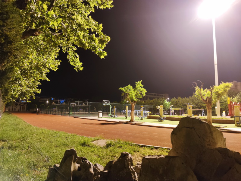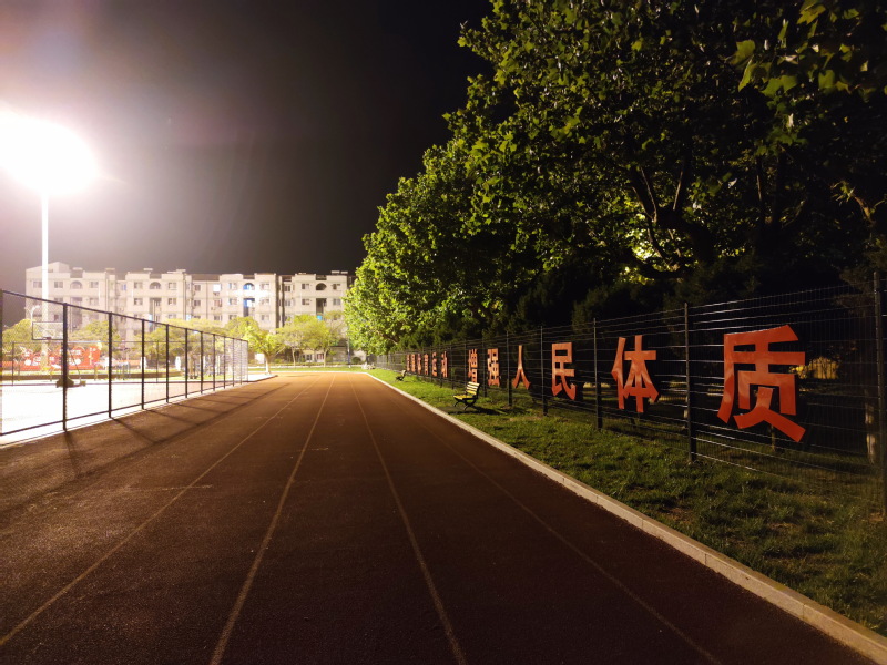 農(nóng)場人的作息時間與城里人不同,與廣場上夜幕剛降臨的熱鬧相比,當(dāng)時間過上夜間9點時分,同樣在職工休閑體育運動廣場內(nèi)卻很難看到人了,他們回家坐上床上美美地看著電視,或是早早地沉浸夢鄉(xiāng),把一天的行程收納。而此時如果你還走在廣場上,就可享受著廣場內(nèi)少有的寧靜和靜謐時刻。靜逸的舞蹈池猶如一面水的池塘,倒映著健身器材和景觀燈,為美麗的夜色增添新的美景。廣場內(nèi)的各種健身器材此時全部靜了下來,在光影下顯得格外壯美。柵欄上“發(fā)展體育運動 增強(qiáng)人民體質(zhì)”的紅色立體字型,紅得更艷,在夜色中別有一番風(fēng)致。降紅色的塑膠跑道齊齊整整,與周邊濃密而又青綠搖曳的梧桐樹相得益彰,如詩如畫和一動一靜的完美結(jié)合,給人以非常地亮眼。