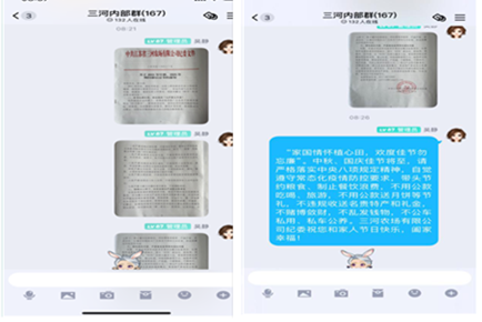 2021年中秋、國慶將至,請嚴格落實中央八項規(guī)定精神,廉潔過節(jié),三河農(nóng)場有限公司紀委祝您和家人節(jié)日快樂!”2021年9月18日,三河農(nóng)場有限公司紀委向全場管理人員發(fā)出了節(jié)日廉潔短信。