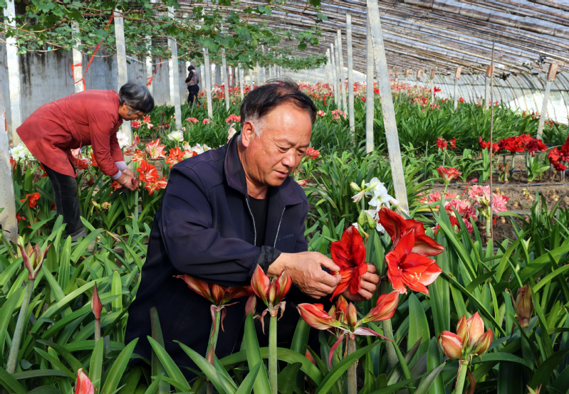 崗埠農(nóng)場公司周恒銀, 和愛人共同種植5棟溫室大棚,10年來自己培育朱頂紅品種達30個。今年培育朱頂紅種苗15萬株,年可銷切花1萬枝,種球2萬粒,年收入40萬元左右,帶動10多戶花農(nóng)走上致富路,2022年3月在農(nóng)場公司職工代表大會上受到表彰。