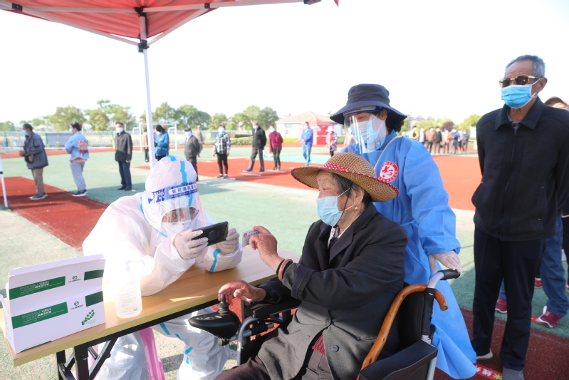 “請從這邊走!”轉(zhuǎn)業(yè)軍人、青年黨員孫強,標(biāo)準(zhǔn)軍人站姿導(dǎo)引著檢測居民有序進入,成為檢測中的一道風(fēng)景。青年黨員趙珊、沈燕是一對好姐妹,由于連續(xù)的叫喊讓沈燕的嗓子嘶啞,今天她倆特意交換的分工。“這隊人少,請到這隊來!”接過好姐妹手中的大喇叭,趙珊大聲招呼著,將進入檢測區(qū)的居民有序分流到3個采樣區(qū)。“你們在這里等我會兒,我先幫你們登記?!?/span>換成維護秩序后,沈燕時刻關(guān)注著檢測的人群。70多歲的王奶奶家住劉圩小區(qū),獨自一個坐著電動輪椅來到劉圩居委會核酸采樣點。沈燕見狀立刻上前引導(dǎo)她來到綠色通道,熱情地幫助她登記信息。不到5分鐘,王奶奶就完成了采樣。沈燕又小心地把她帶到了檢測出口。細(xì)心的黨員孫偉,在檢測中發(fā)現(xiàn)有不少行動不便的老人。今天他提前借來了一輛輪椅,看到年老體邁的老人,他就主動迎上去,把老人推進檢測綠色通道,從掃碼測溫到登記采樣,再到出口離開,最后把老人安全地交到老人家人手中。