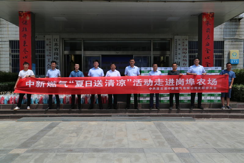 8月2日上午,連云港市中新燃?xì)庥邢薰緛韻彶?,開展“夏日送清涼”活動(dòng),為崗埠送來純凈水200箱,毛巾、洗衣液、香皂等慰問品130份。農(nóng)場公司黨委副書記、總經(jīng)理王建波,總經(jīng)理助理何璜煒參加活動(dòng)。