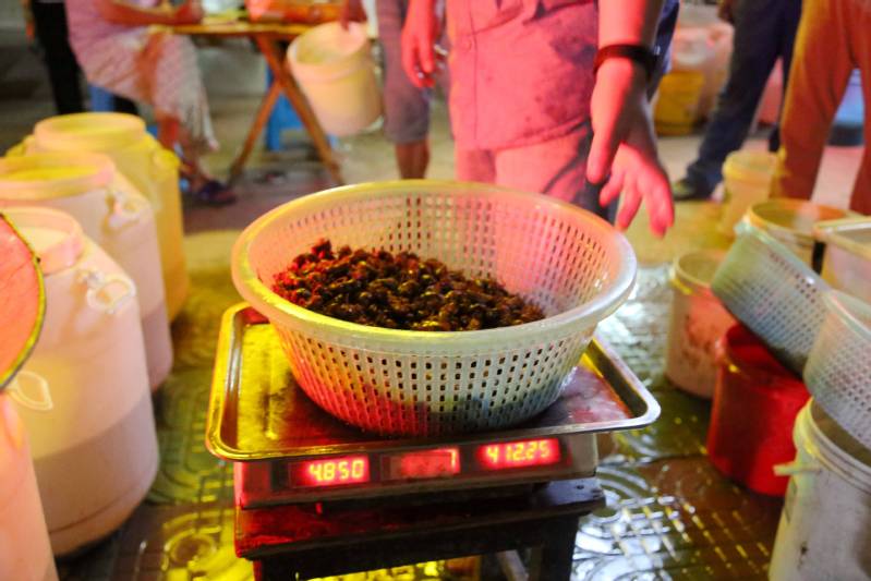 夏夜暑熱退去,新曹農(nóng)場河邊林帶、國道兩側(cè)、集鎮(zhèn)周邊,小樹林里經(jīng)常光影搖曳、星星點點,人們拿著手電筒等照明裝備仔細在每棵樹上尋摸,只為找到獨屬夏季的舌尖美味——金蟬。老百姓熱衷抓蟬、吃蟬,價格由最初的每只0.3元到如今的每只1元左右,10年內(nèi)小小金蟬身價翻了3倍,一躍成為新的致富“頂流”?!敖鹣s捕捉高峰期能有20多天,一家人一晚可以捉1000多元,每年靠捉金蟬就有近2萬元的收益,我們這一個點一晚收購數(shù)量在5000斤以上,平均價每斤90元以上,年產(chǎn)值900萬元?!苯鹣s收購點老板何成剛說。