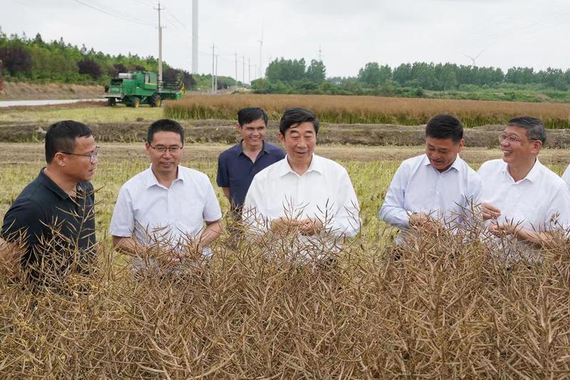 6月1日上午,集團(tuán)公司黨委副書記、總經(jīng)理胡兆輝到弶港檢查指導(dǎo)“三夏”工作。胡兆輝先后考察了蘇墾農(nóng)發(fā)弶港分公司小麥田、糧食烘干線、油菜收割現(xiàn)場(chǎng),認(rèn)真聽取一線工作人員的情況介紹,詳細(xì)了解蘇墾農(nóng)發(fā)弶港分公司“三夏”工作進(jìn)展,對(duì)當(dāng)前夏熟作物的生產(chǎn)與管理工作以及全力支持“淮海啤麥會(huì)戰(zhàn)”工作表示充分肯定。他指出,由于天氣影響,今年“三夏”生產(chǎn)形勢(shì)十分嚴(yán)峻。要圍繞“五不”和“五確?!蹦繕?biāo),統(tǒng)籌利用農(nóng)機(jī)、曬場(chǎng)、烘干、糧庫等資源,搶抓關(guān)鍵農(nóng)時(shí),確保夏糧豐產(chǎn)豐收。他要求,要深入開展好主題教育,按照“學(xué)思想、強(qiáng)黨性、重實(shí)踐、建新功”總要求,貼近工作實(shí)際開展好調(diào)查研究,查擺問題,把調(diào)研成果轉(zhuǎn)化為解決問題、改進(jìn)工作的實(shí)際舉措;要堅(jiān)決打贏“三夏”這場(chǎng)硬仗,弶港要一如既往地在保種子上挑大梁,確保不壞一粒種子,油菜、商品糧做到顆粒歸倉,為保障糧食安全做出應(yīng)有的貢獻(xiàn)。要高質(zhì)量做好夏插、夏管工作,為秋熟豐產(chǎn)豐收打下堅(jiān)實(shí)基礎(chǔ)。針對(duì)可能出現(xiàn)的惡劣天氣,做好支援兄弟農(nóng)場(chǎng)夏收會(huì)戰(zhàn)的各項(xiàng)準(zhǔn)備工作;要統(tǒng)籌謀劃,做好安全生產(chǎn)、社區(qū)管理、產(chǎn)業(yè)發(fā)展等各項(xiàng)工作,將主題教育的學(xué)習(xí)成效落在推動(dòng)企業(yè)高質(zhì)量發(fā)展的工作實(shí)績(jī)上。